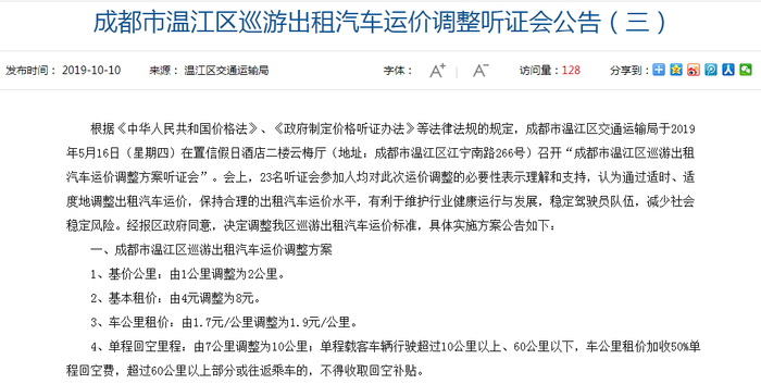 ▎成都市温江区巡游出租汽车运价调整方案