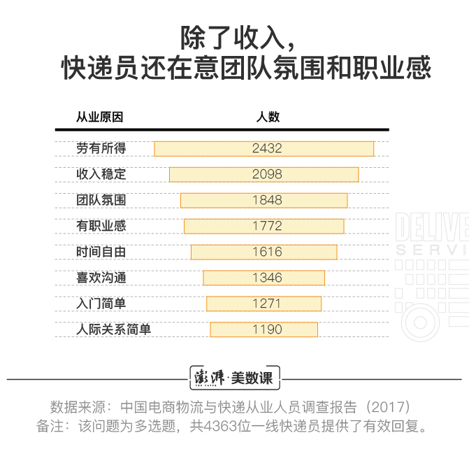 中国物流与采购联合会,在2017年时曾联合顺丰速运、苏宁物流等企业共同发起“中国电商物流与快递从业人员问卷调查”,并收到4363位一线快递员的有效回复。在问及为何选择快递员这一职业时,尽管经济回报率仍是最受重视的因素,但快递员们还看重“团队氛围”和“职业感”等形而上的需求。