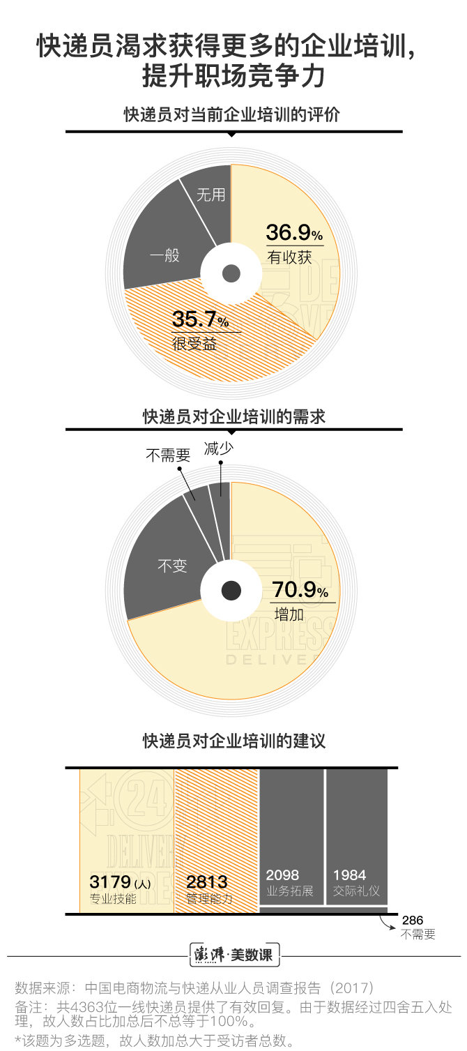 在中国物流与采购联合会2017年发布的《中国电商物流与快递从业人员调查报告》中,快递员们在肯定当前企业培训的同时,传达出希望企业增加培训的强烈欲望,并希望能获得“专业技能”、“管理能力”、“业务拓展”等多方面的学习培训机会。