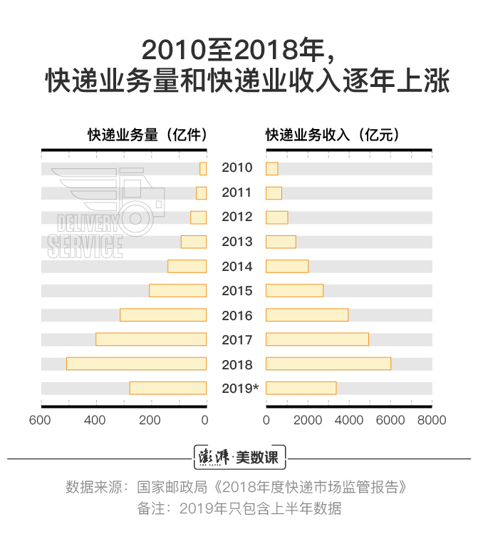 据国家邮政局数据,近9年时间,全国快递业务量和业务收入均增长了10倍以上。7月22日公布的最新数据显示,2019年上半年,全国快递业务量和业务收入分别达到277.6亿件和3396.7亿元,同比增长25.7%和23.7%;这个水平,甚至超过了2015年时的全年总量。