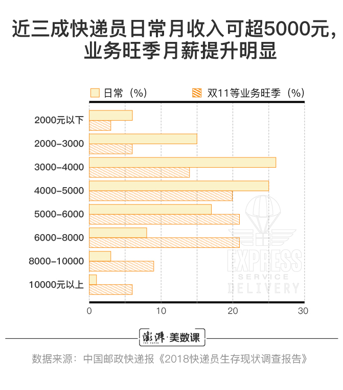 在电商行业蓬勃发展的当下,消费者或许不会再像几年前一样,粗暴地将快递员划为低收入人群。即便许多快递员的月均收入并未高达网传的破万,但多劳多得的激励机制的确让一部分人收获颇丰。根据苏宁物流的数据,2018年该公司的快递员忙季时的月均收入可以达到7500元以上,而其中收入最高者可以收获2万元月薪。