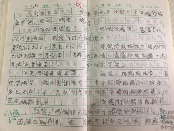 在家中,赵玉展示了自己患癌以来小锦谊写的十多本日记。他会把自己的日记与妈妈分享,并告诉妈妈,自己就是妈妈看世界的眼睛。