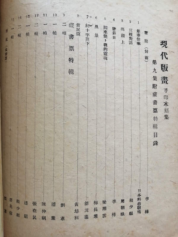 1934年6月,李桦先生在广州成立了现代版画会,带领部分学生进行版画创作。除李桦先生外,比较活跃的作者还有赖少其、刘宪、唐英伟、陈仲纲、潘业等人。这个团体都是年轻人,身为老师的李桦先生当年也不过二十七岁。他们具有强烈的社会责任感和进步倾向,作品关心时代和社会民生,充满活力。这个团体虽然总共只存在了三年,但他们在短短三年内组织了多次展览,创作并出版了很多作品,包括十八集著名的《现代版画》。除第一期为机器印刷,出版五百本外,其余均木刻手拓,用手工纸精印,出版五十至一百册不等。流传至今已稀如星风,目前所知仅鲁迅博物馆藏有全套十八集。其中第九集《藏书票特辑》,共收十四位作者的十九帧版画作品,包括封面和封底各一帧,以及日本版画家料治朝鸣作品一帧。此集前半为版画作品,其中如李桦“发薪日”、赖少其“三种对话”、胡其藻“红十字旗下”等,都是优秀的现实主义作品;后半为藏书票特辑,共十一帧作品。分别是刘宪三帧、潘业一帧、陈仲纲一帧、张在民两帧、潘昭一帧、赖少其两帧、唐英伟一帧。这十一帧作品也是有具体时间可考的,我国版画家所绘制并刻印的最早藏书票。这些藏书票带有鲜明的民族风格和早期木刻的稚拙生气,兼具艺术性和时代性。比如其中的潘业藏书票,利用了类似民间砖雕的创作手法,表现了一位读者走路时仍捧书而读的画面,其身后还跟着一只小狗,浓郁的生活气息扑面而来。虽然艺术手法尚显稚嫩,但其中蓬勃的朝气和浓郁民族风格却很难得。唐英伟的作品则以有力的刀法和强烈的画面对比,塑造出一个在读书思考的青年形象,也是十分优秀的作品。