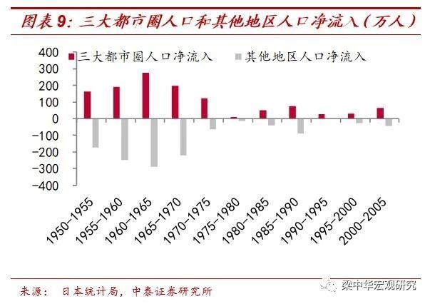 整体的城市化进程放缓后,日本的大都市化进程仍在持续。在1975~2000年间,三大都市圈人口占比从55.3%进一步提升至57.6%。如果剔除掉人口的自然增长,1995~2000年日本三大都市圈净流入人口达到30.5万,而同期其他地区人口净流出26.5万。三大都市圈在日本27.2%的国土面积上,集聚了55%以上的人口,创造了日本全国60%以上的GDP。