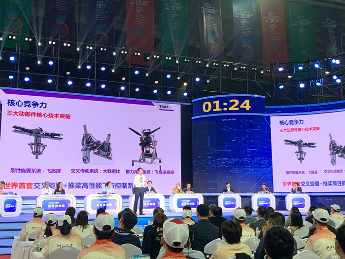 目前,我们的飞机主要有两个亮点:一是交叉旋翼,一是推力尾浆。交叉旋翼是载重比较高,加上推力尾浆之后速度比较快,所以我们又有载重又有速度,就变成世界首架交叉双旋翼复合推力尾桨无人机。