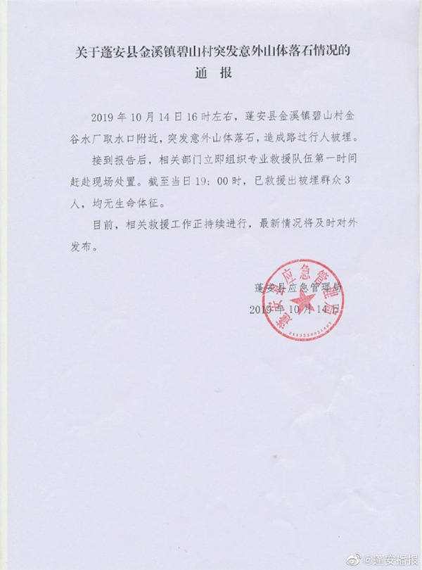 四川南充市蓬安县人民政府官方微博@蓬安播报 10月14日晚发布“关于蓬安县金溪镇碧山村突发意外山体落石情况”的通报。