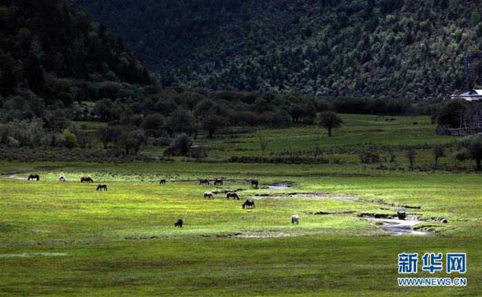 在云南迪庆藏族自治州普达措国家公园内,牲畜在洛茸村民小组附近的草甸上吃草(9月16日摄) 新华社记者 张誉东摄