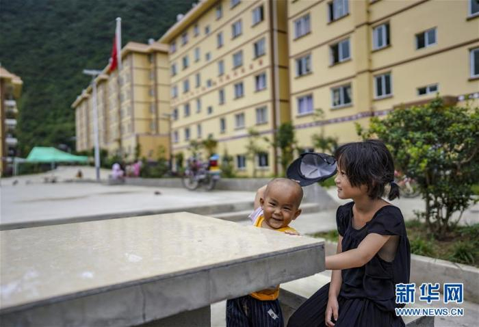在云南怒江傈僳族自治州泸水市大龙塘易地扶贫搬迁安置点,6岁的麻医平(右)带着弟弟在院子里玩耍(9月15日摄) 新华社记者 江文耀摄