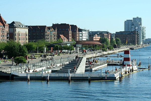 哥本哈根是北欧最具魅力的海滨城市之一。由于特殊的城市规划理念和景观设计思路,使得其滨水区域的空间规划极具特色。哥本哈根整体的城市规划也与水紧密联系在一起,水作为城市景观的主题,形成了由海港、湖泊、运河、海滨等共同组成的滨水空间。早期城市规划“指形规划”中的一个延伸方向就是向东、南和北发展。向南主要是1993年在哥本哈根市政规划指导下开始对阿玛岛(Amager Island)进行规划,以实现为连接邻国瑞典。2000年的厄勒海峡跨海大桥建成后,阿玛岛开始实施“水之城”的建设。重点在于打造一条长12公里的滨水空间带,提高居民在这一区域内休闲娱乐,与水互动的可能性。力图打造一种人与自然高度和谐的空间。同年,政府开始对北部海港Nordhavnen和南部海港Sydhavnen,以及老城区海港Inderhavnen三处进行全面开发,以完成城市滨水区域的整体开发。