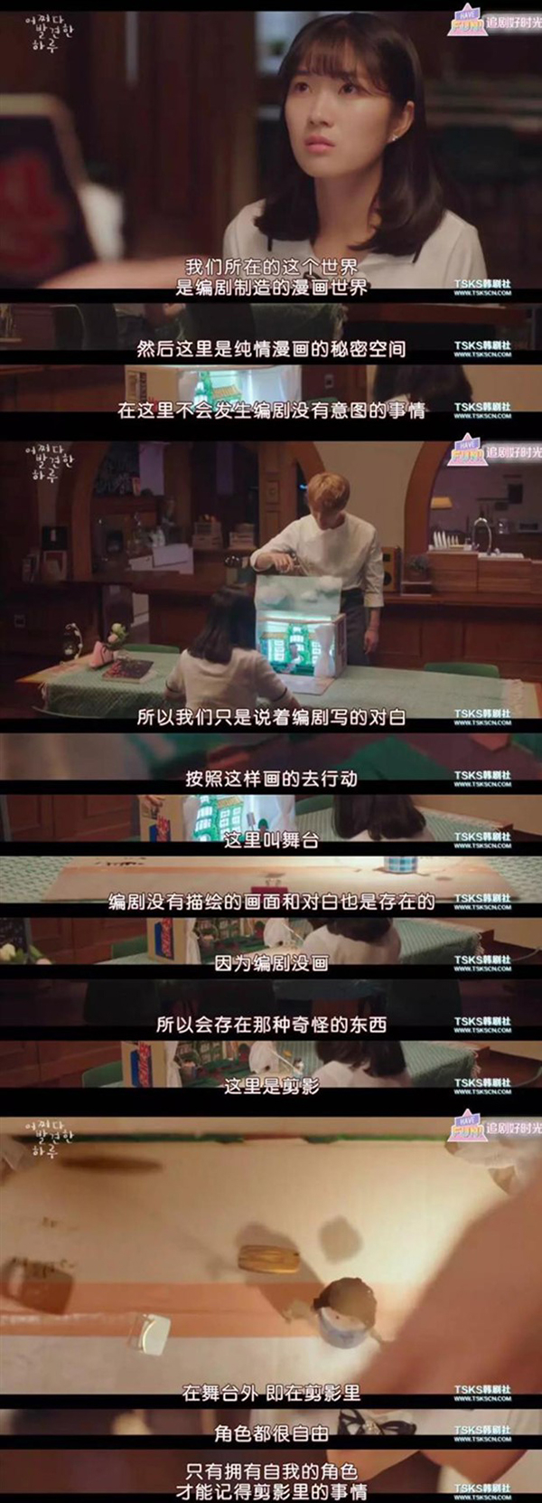 其次,必须表扬女主角金惠允生动活泼的演技。金惠允凭借去年底的爆款韩剧《天空之城》中姜艺瑞一角而被观众所熟知,而在《偶然发现的一天》里,她充分展示了她的无限可能。剧集大部分场景是女主角一个人的独角戏,拥有自由意志的她,与漫画中作为配角的她,经常相互“斗争”。殷端午得随时切换性格,漫画中的她柔软脆弱,殷端午一边扮演着柔软脆弱,一边又切换到自由人格,满满的内心戏,种种吐槽出口成章。金惠允把拥有自由意志的殷端午的活泼、爽朗、乐观、坚韧、有趣演得活灵活现,整部剧的节奏也因为她而灵动起来。