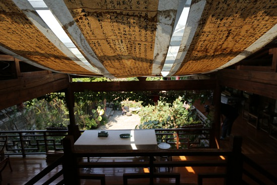 叶家夫妇是老徽州人,谈及董其昌、吴廷、《余清斋法帖》……这些西溪南村深厚的书画渊源,如数家珍。草堂的整体设计上,随处可见主人的文化底蕴和书画元素——喝茶谈话的地方,题作“奇峰阁”,化用石涛的诗句“搜尽奇峰打草稿”,也包含堂主姓名的“奇”字。再比如,用叶丹奇书法草稿作为遮阳装饰,慵懒的阳光透过纸墨,别有一番雅趣。更不用说,一楼堂屋、二楼回廊,变化花样陈列许多书画艺术家的作品,其中不少创作灵感因西溪南而起。