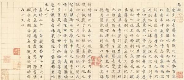 古琴的记谱方法是古琴独有的,只有古琴才有这个记谱方法,现在我们讲减字谱。从古琴的历史发展来看,最初是文字。所谓“文字谱”就是讲一个故事,成为一个故事情节,然后弹琴的人根据故事情节演绎,所以没有固定的谱子。到了唐代才有真正的记录方法,叫减字谱,就是把我们汉字里面的很多笔划省略了,留下一些笔划做一个记号,来记载古琴的弹奏方法。而且把这些减去的东西去掉以后,留下的符号拼在一起告诉你怎么弹琴。