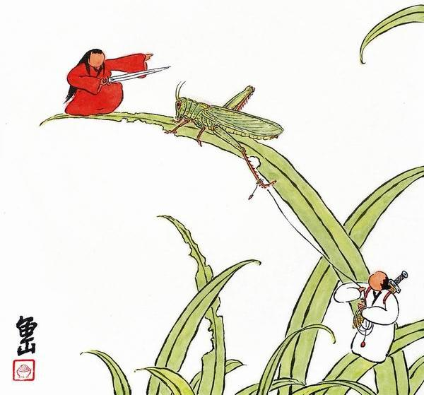 在鱼山的画里,房子慢慢消失了,连器物也越来越少,更多的是与花叶虫鸟、天地自然的互动。人物的比例越来越小,小到随处可作居游之所。在草间,大侠能飞针击杀蚊子