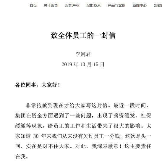 非常抱歉到现在才给大家写这封信。最近一段时间,集团在资金方面遇到了一些问题,出现了薪资缓发、社保缓缴等现象,给员工的工作和生活带来了很大的影响。大家知道30年来我们从来没有欠过员工一分钱,这次是头一回,实在是对不住大家。对此,我深表歉意!这主要责任在我。