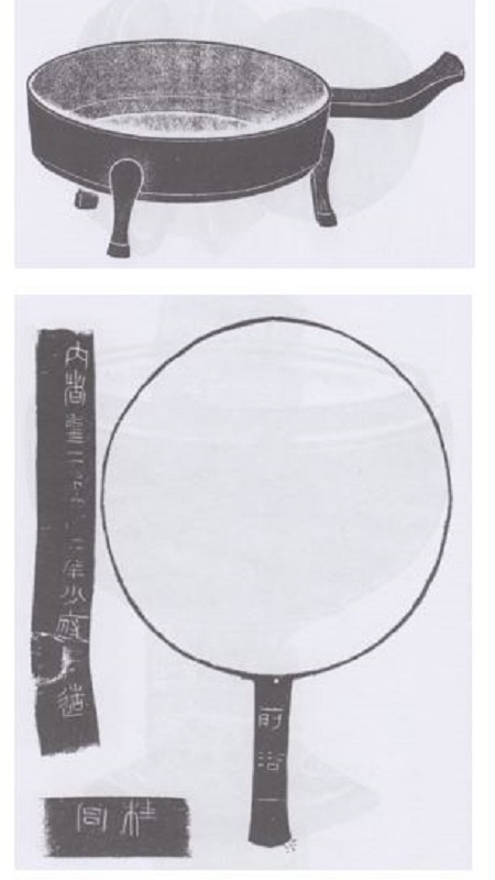 内者未央宫尚浴府乘舆金缶铭文(左)内者未央宫尚浴府乘舆金行烛鎜铭文(右)(据容庚《武英殿彝器图录》与陈介祺《簠斋金文考》)
