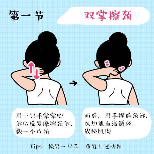 用一只手掌掌心部位反复摩擦颈部,数一个八拍后,用手捏后颈部,以加速血液循环,放松肌肉。然后换手,重复上述动作。