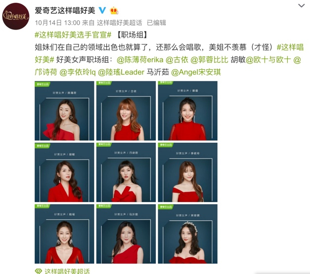 会上间隙,已经有好几位上来做了助唱表演,统一大红色连衣裙配上绶带,颇有选美比赛的意思。根据介绍,这是一档“不同年龄身份的背景的好美女生以自身独特的个性和故事,加上自身的情感,对华语经典名曲进行演绎和解读,展现东方女性多维之美”的节目。简而言之,86个女孩分网络组、高校组、妈妈组、职场组等轮番上来唱经典华语歌曲,不仅要看唱得好不好,美也非常重要,还要有不同的美,更重要的是,要有故事性。蔡琴、张绍刚、金培达、谢娜、李承铉、戚薇、刘宪华、陈立农将组成评审团,去点评发掘她们身上的美。