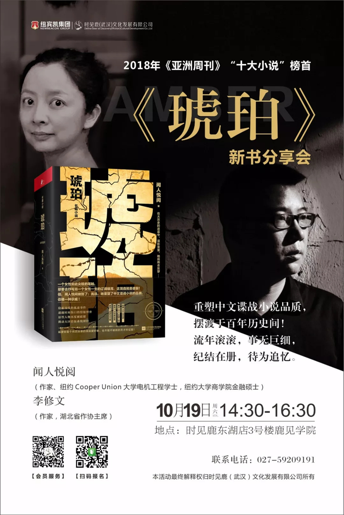 2019年5月,作家闻人悦阅新书《琥珀》简体版正式在大陆上市。该书讲述了一位女子走入命运和时局,冷眼看风云权利更迭,在东西阵营间架起桥梁,游走四大情报机构,缔结庞大商业帝国的故事。10月19日,作者闻人悦阅走进武汉,同湖北作协主席李修文做客时见鹿,与大家一起讲述和分享《琥珀》创作过程中的故事。