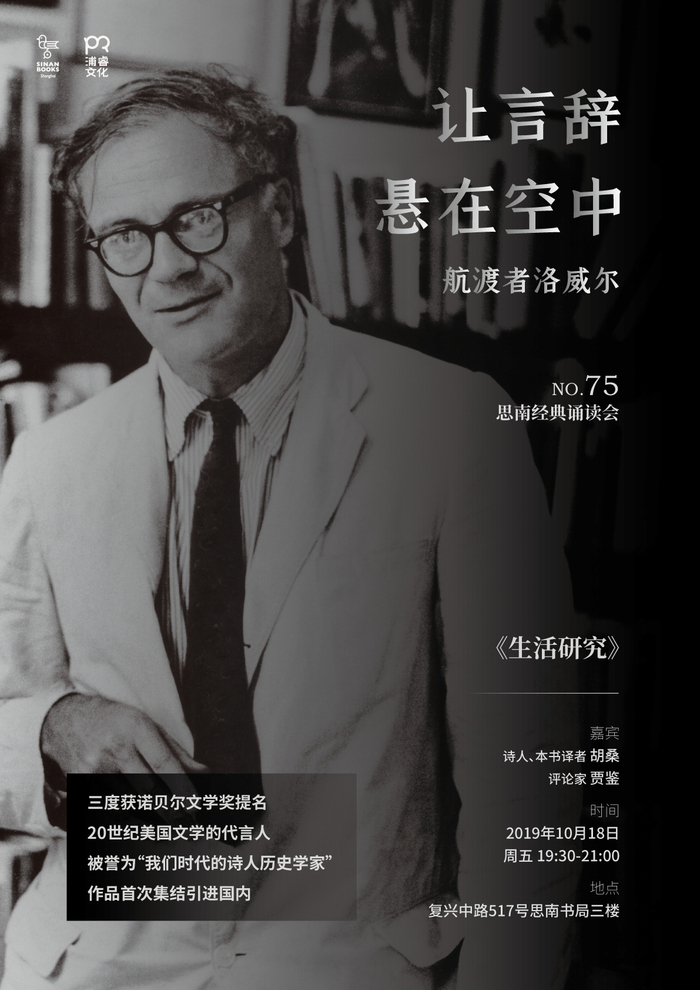 本周五晚,《生活研究》译者、诗人胡桑及评论家贾鉴将做客思南经典诵读会,通过对洛威尔诗歌的分析解读,展现其不同寻常的一生和内心轨迹。两位嘉宾还将阐述洛威尔诗歌写作的特点(宗教、历史与现实的相互映照,激情与克制的辩证关系,“非个人化”与自白诗学的融汇等),揭示其诗歌风格和主题的变化过程(早期的严谨和正典化,中期对生活经验的纷繁细节的处理和对历史问题的容纳,晚期对诗艺的反思和写作渐趋辽阔的效果等)。