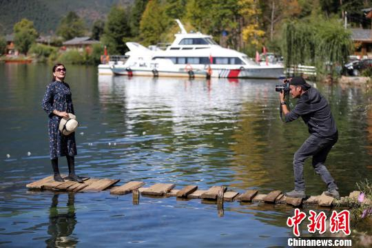 中新网盐源10月18日电 (起钰婷)“摸下头发”“转身”“微笑起来”……18日,在四川泸沽湖景区的泸源崖上,36岁的“走山人”奥高翁机正举着单反相机,指导游客调整拍照角度和动作神情。奥高翁机已接触旅行拍摄三年,在加入“走山人”团队之前,他是泸沽湖当地的一个客栈老板。