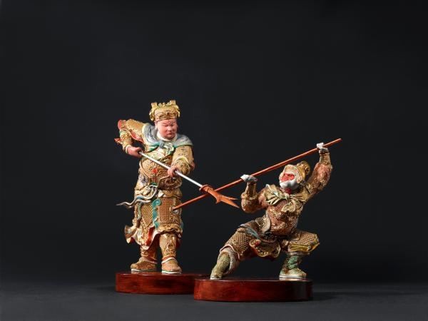 泥胎金彩漆线雕孙悟空战杨戬,蔡文沛,1958年