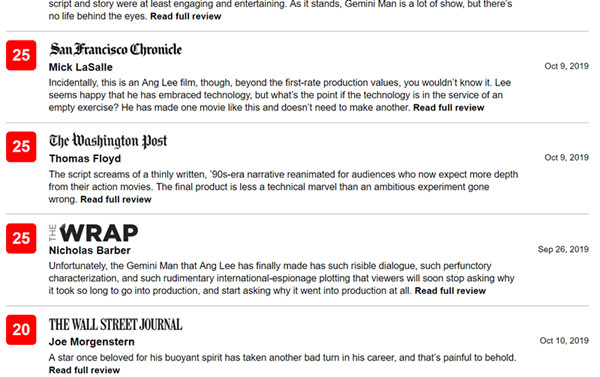 至于口碑,更是遭到了几近一边倒的差评。目前烂番茄仅25%新鲜度,IMDB5.6分,Metacritic评分38。如果仅仅是从评分来看,《双子杀手》已经在北美进入了“烂片”行列。至于中国大陆口碑,也是李安近10年来评分最低的作品,豆瓣评分7.1分(截至10月18日,超过1.3万人评分),是李安作品中倒数第二低分(仅高于《绿巨人浩克》的6.7分)……