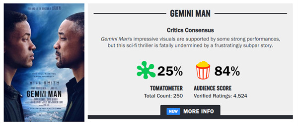《双子杀手》的烂番茄新鲜度只有25%(截至10月18日)