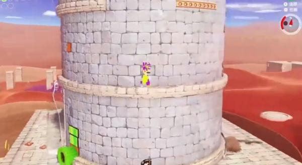 这种自觉的“媒介意识”,这种主动暴露自身物质性的媒介自反行为,也淋漓尽致地体现在《超级马里奥:奥德赛》的“内容”层面,尤其是其中广受好评的“平面关卡”的设计之中。几乎在该作中的每一个大型关卡(地图)之中,都会隐藏着至少一个以上的“平面关卡”,一旦“钻入”这些特殊的关卡,马里奥就会从“外部”的三维形象被“降维”成一个低像素的二维平面形象,马里奥周边的环境、敌人也都同样变成二维的(视觉上的奇妙之处在于关卡外部的游戏世界看上去依然是立体的)。而这些“二次元”的低像素关卡,显然是对任天堂公司早期的马里奥游戏,尤其是对最著名的1985年版《马里奥兄弟》(横版卷轴游戏的始祖)的媒介互文。