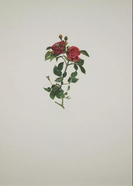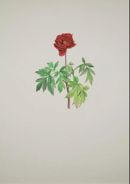 这是一排水平悬挂在墙上的小幅绘画,一组十分规整的国花“肖像”。面对着它们时,我产生了置身于某个自然史博物馆或植物标本馆的错觉。不同的是,它们不是真实,但却在某种程度上拟真——一株植物的形象清晰地出现在你的眼前,高度具象但又不完全写实,色彩清雅,不存在任何的图像叙事与其他视觉干扰元素——似乎你正翻看着某本精美花卉图谱里的一页,或者正凝视着一株立在透明玻璃瓶里的标本。如果没有展览主题与图像下方的文字介绍所提供的语境,观众恐怕难以对自己眼前的图像进行准确的定位并展开联想。这让人不禁要问:为何纳杰德选择了这样一种似乎过时的表现方式?使用一种朴素的植物学研究式的呈现方法?她又为何要画国花?
