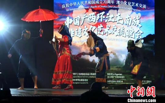 中新网环江10月19日电(记者 杨志雄)10月18日晚,在悠扬的民族器乐伴奏下,伴着原生态民歌响起,一场极具东方少数民族特色的视听盛宴在澳大利亚墨尔本白马市博士山市政厅舞台上演。这是中国唯一的毛南族自治县——广西环江毛南族自治县“毛南音韵”艺术团带来的精彩演出。