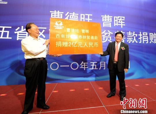 近日,福耀玻璃工业集团股份有限公司创始人、董事长,中国光彩事业促进会副会长曹德旺接受中新社记者专访。据了解,从1983年的第一笔2000元人民币开始,到2018年他已捐出近50%的个人资产共110亿元,用于慈善事业。图为2010年5月,曹德旺(右)与中国扶贫基金会在昆明签订2亿元捐赠协议。 钟欣 摄