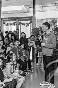 丰富夸张的肢体动作、抑扬顿挫的语调、幽默风趣的语言……与小酷哥哥面对面,100多个孩子聚集在一起可以做到鸦雀无声,他们聚精会神地竖起耳朵聆听,学习他的写作秘诀。