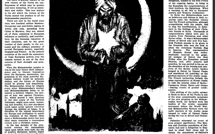 1922年10月,土耳其军打败希腊侵略者,轰动了整个中东地区。12月,《纽约时报》刊发了题为“Kemal as He Looks to the Mohammedan World”的长文,文章作者Habeeb G. Istfan明确站在欧洲列强的立场上,敌视穆斯林的独立运动,忧心忡忡地写到: