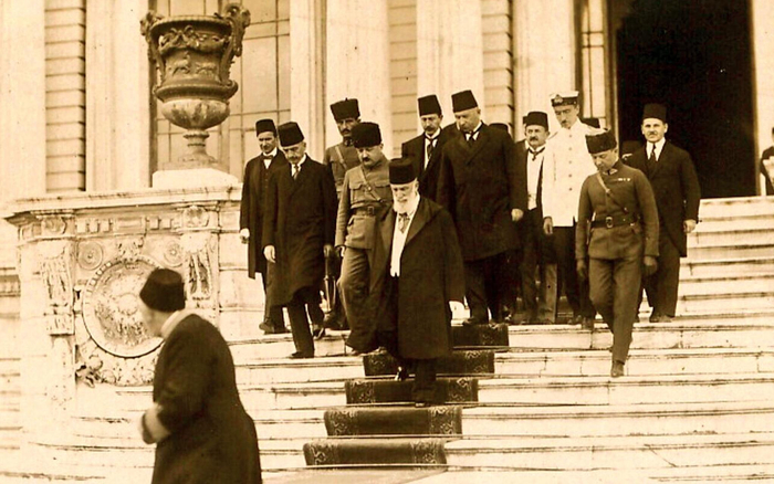 阿卜杜勒·麦吉德二世(走在最前方的老者,但在当时尚不到60岁)。1924年3月,土耳其共和国又废除了哈里发制度