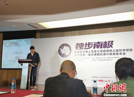 “全球首次单人无助力穿越南极公益科学探险暨《光语者-独步南极》纪录片”新闻发布会21日在中国地质大学(北京)举行。 夏宾 摄