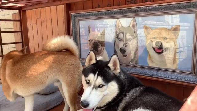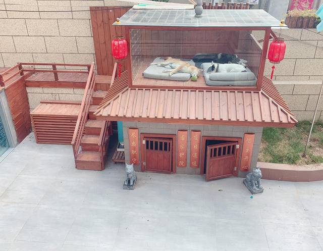 记者注意到,在院外就能感受到三条狗狗居住环境的豪华,进入院内更是打开眼界。狗狗的主卧室是两层颇有古典色彩的楼房,在一楼,周小帅将此戏称为狗狗值班室,里面装有一台空调,周小帅还特意在门口刻上两幅对联:“看家护院 忠于职守”、“陪主开心 度日逍遥”。在狗狗值班室旁边则是主动投食机,周小帅告诉记者,因为他工作比较忙,这台智能投食机可以通过手机APP来远程控制,这样,万一家里没人,狗狗就不会挨饿,它们仨每月的伙食费差不多1200元左右。吃完饭后,狗狗会顺着楼梯爬上二楼的阳光房休息,记者看到,阳光房的地面铺着沙发垫,这样狗狗休息的时候会很舒服,不会觉得硬,墙上还挂着三条狗狗的全家福——这张全家福还是他请天津美院一名教授花3000元画的,周小帅说。
