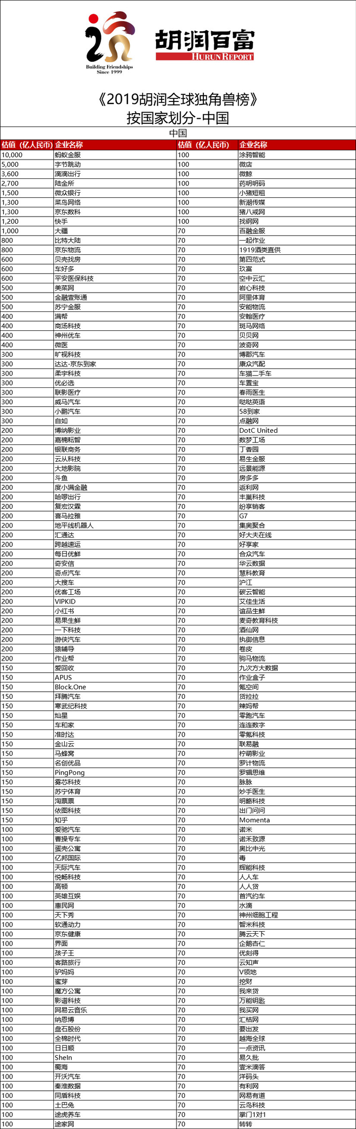 2019胡润全球独角兽榜:中企数量首超美国