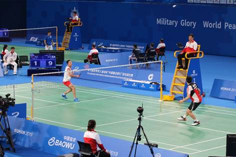 10月21日,第七届世界军人运动会羽毛球项目比赛在武汉大学大学生体育活动中心(卓尔体育馆)正式开赛。上午9:00,男子团体循环赛的两场比赛同时进行。来自12个国家的68名运动员将在这里参加为期6天的比赛,角逐羽毛球项目的六块金牌。