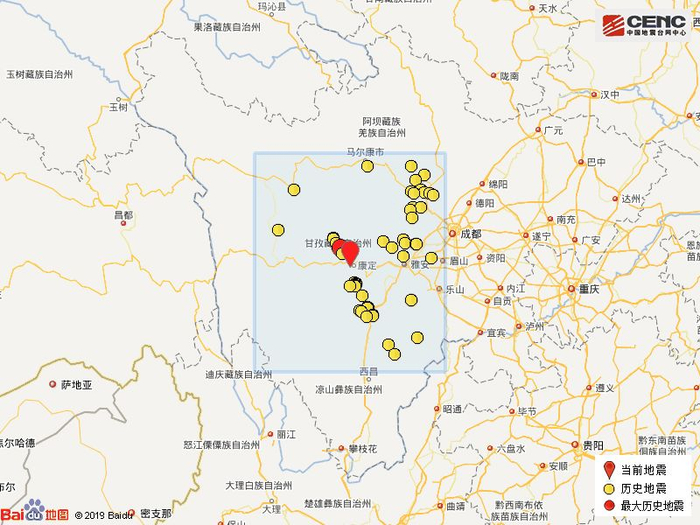 历史地震:根据中国地震台网速报目录,震中周边200公里内近5年来发生3级以上地震共74次,最大地震是2014年11月22日在四川省甘孜藏族自治州康定县发生的6.3级地震(距离本次震中29公里),按震级大小前50次历史地震分布如图。