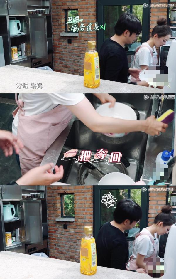 节目组后期自然不会放过这个热点。一开始看到吉娜在洗碗,一旁的郎朗赶紧走上前,说“给我吧”,并拿走碗。节目组配上了马里奥游戏得分的音效,花字备注“获得家务道具X1”,吉娜回答“我要快一点”,花字形容吉娜的动作是“一把夺回”。随后花字在郎朗头上加了一团毛线,表示郎朗抢活无果的无奈。