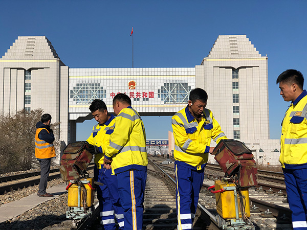 海拉尔工务段满洲里探伤班组的探伤工们在国门下作业。