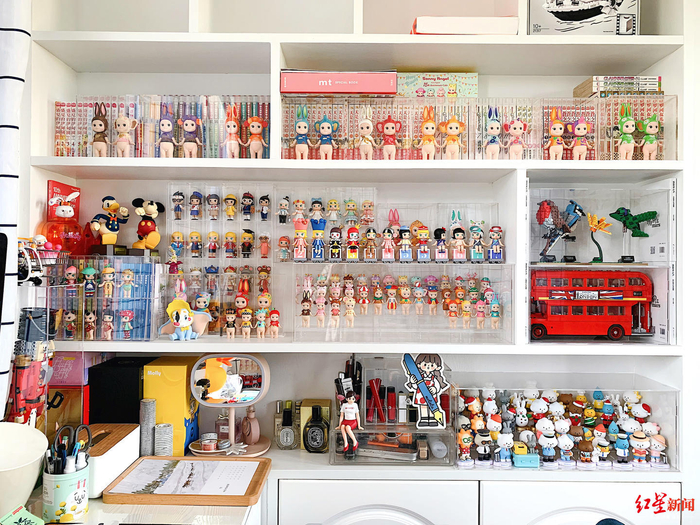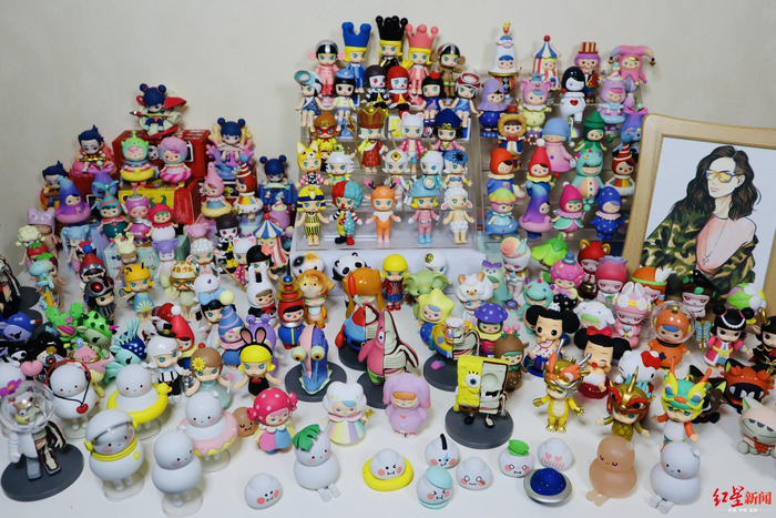 “我有收集癖,缺一个会觉得很难受。”玩了六年多盲盒的小沈现在家里大概有七八百只娃娃,按均价59元一个来算,这些年小沈在盲盒上花费了四万多元。“花59元抽中一个隐藏款依然会很激动,感觉像中了彩票。”小沈告诉记者,收集过程本身带来的情绪波动是她的快乐源泉之一,通过盲盒她还认识了很多朋友。