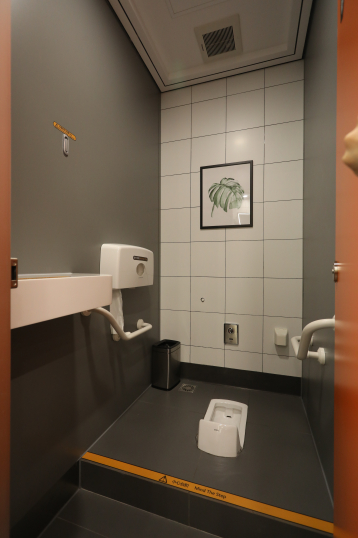 比如厕位隔间的宽度,在空间上要比一般的商场更加宽大。为什么这么设计?黄迪向记者解释,因为很多旅客携带着行李上厕所,所以要给行李留出空间。改造之后,原本位于马桶后方的置物台被挪到了前方,旅客如厕后遗落物品的可能性也减少了。置物台的高度也经过精心设计,下方正好可以放得下28寸的旅行箱,上方可以放置大型背包,减少了空间冲突。厕位隔间内增加了无障碍扶手和紧急呼叫铃,照顾到了行动不便旅客的需求。