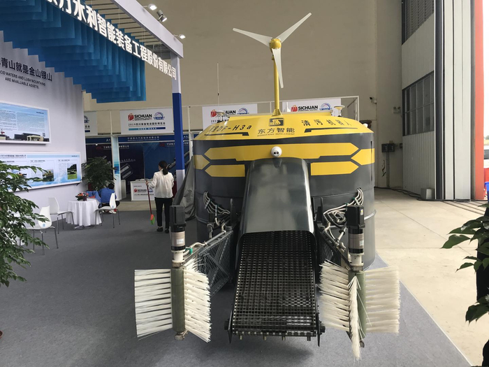 22日,在2019装备博览会,四川东方水利公司能携“河宝”DF-H1型、DF-H2型、DF-H3型水上智能清污机器人亮相。