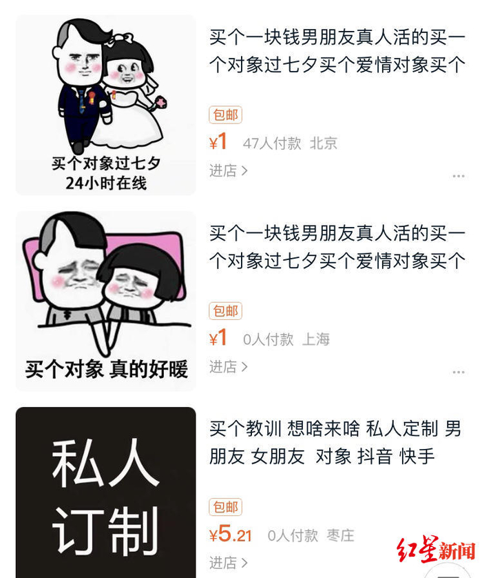 随后红星新闻记者在购买平台搜索关键词发现,弹出的消息不一,“男友”的价格均在几块,稍贵一点的十几元,最低的只需要一元。