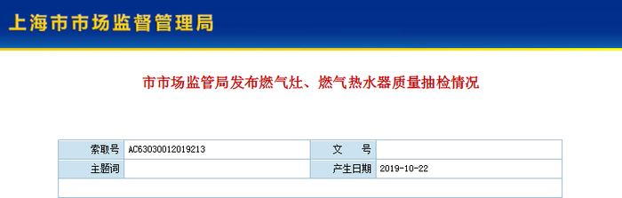 10月22日,上海市市场监管局发布公告表示,近期上海市市场监管局对1家超市、2家商场、8家建材市场销售的49批次家用燃气灶、家用燃气热水器进行了市场检查和质量抽检。其中,一款樱花卫厨(中国)股份有限公司生产的热水器因无法点火而被通报。
