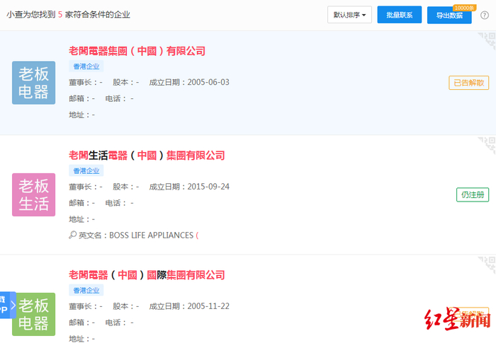 乍一看,似乎是“老板电器”的一款燃气灶产品也因为质量问题而上榜了。但是据了解,市场上广为人知的“老板电器”企业全称为“杭州老板电器股份有限公司”,而非“老板电器集团(中国)有限公司”。而记者在企查查上也未查到符合相关条件的同名公司。