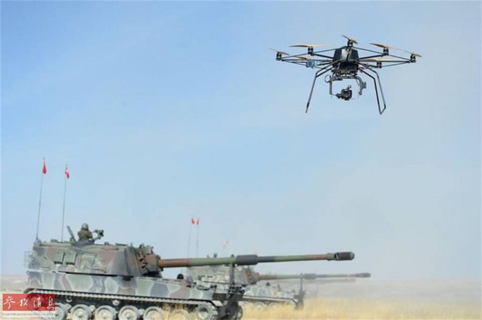 土耳其引进K-9自行火炮,主要是看重了其射程远和爆发射速能力,比较适用于伴随土军装甲部队行动,压制隐藏在山区的库尔德工人党武装。图为2015年10月,土耳其军队举行代号为”Ate Serbest 2015“大型军演期间,土军使用多旋翼无人机拍摄国产T-155(韩国K-9出口型)自行火炮野外推进。