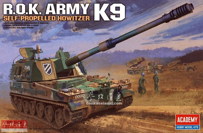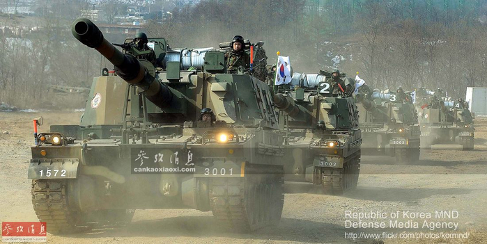 K-9自行火炮由韩国三星集团研发,在历经9年(1989-1998)的技术攻关后,终于在1999年投入韩军服役。K-9是是亚洲第一款采用52倍径长身管的155毫米自行火炮,此前只有德国的Pzh-2000自行火炮采用了相同倍径。图为静态展示的K-9自行火炮。