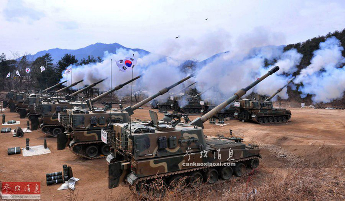 图为韩陆军K-9自行火炮群在山间进行齐射打靶。